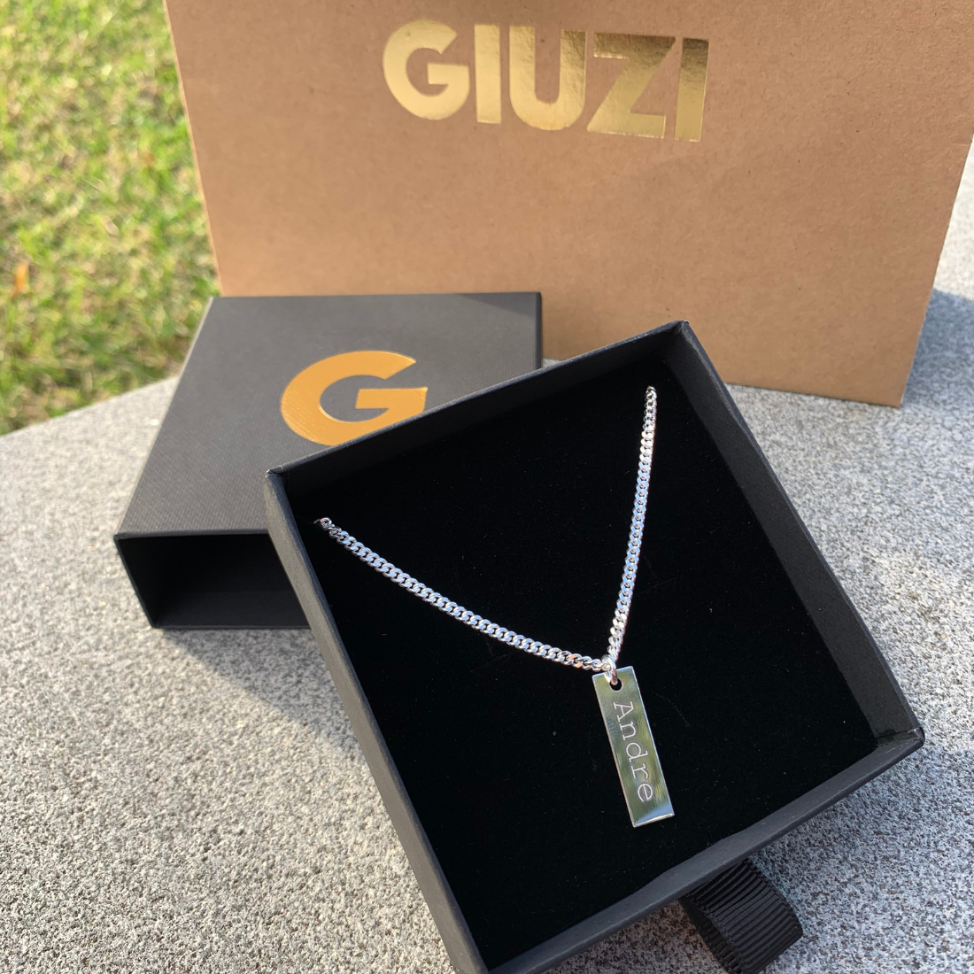 La collana è realizzata in Argento 925 certificato da bollo e marchio, la ricevi completa di scatolina. La targhetta liscia spazzolata è agganciata su una collana di grumetta sottile ma estremamente resistente e saldata a mano.