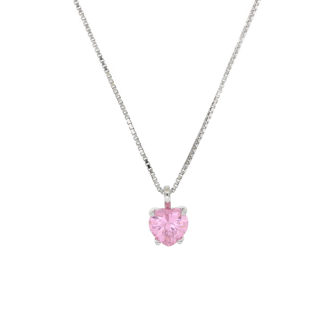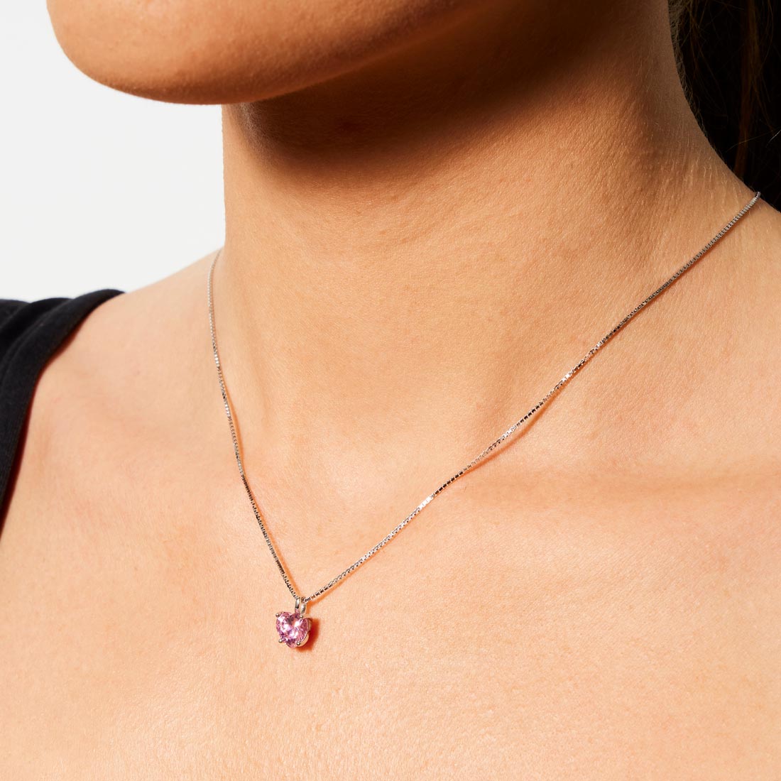La collana è realizzata in argento 925 ed ha un pendente con zircone rosa a forma di cuore.