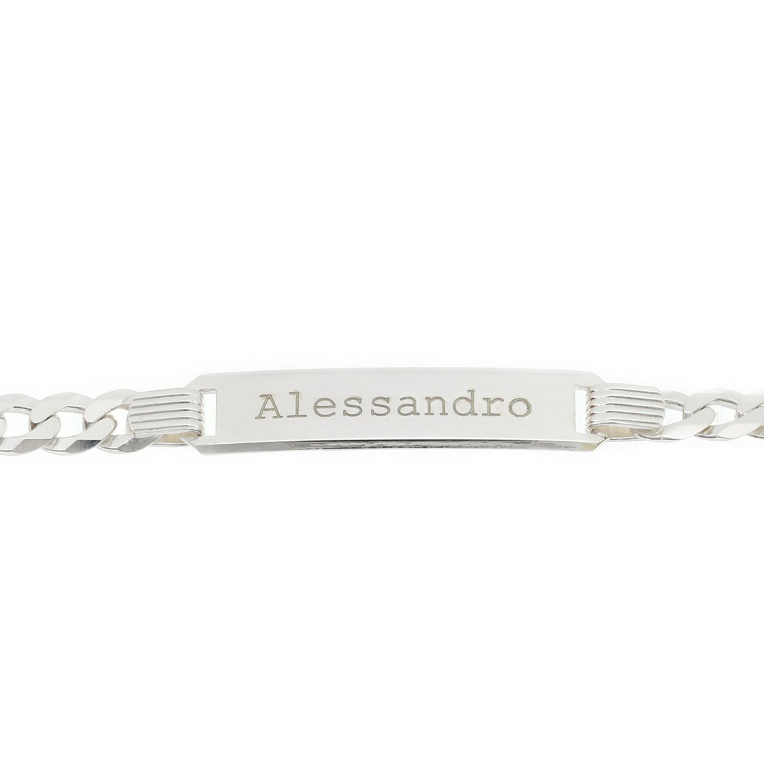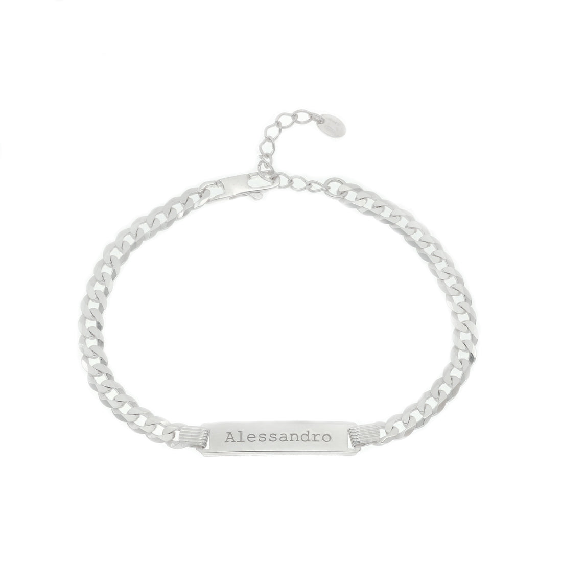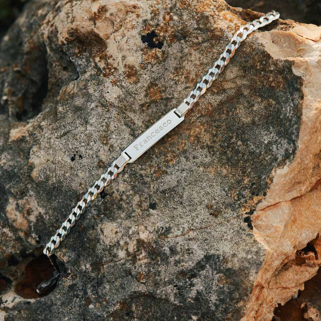 E' realizzato in argento 925 con catena grumetta piatta, ha una targa centrale su cui puoi scrivere ciò che vuoi: il nome di chi lo indossa, il nome dei figli, una parola o una data speciale.