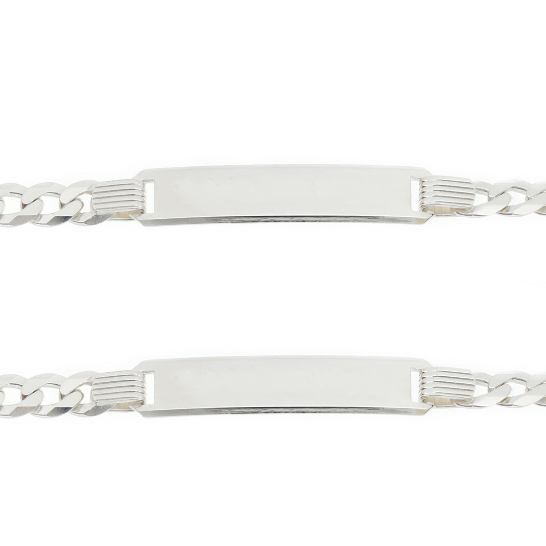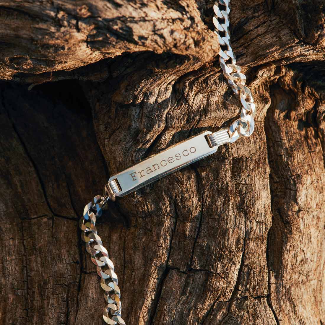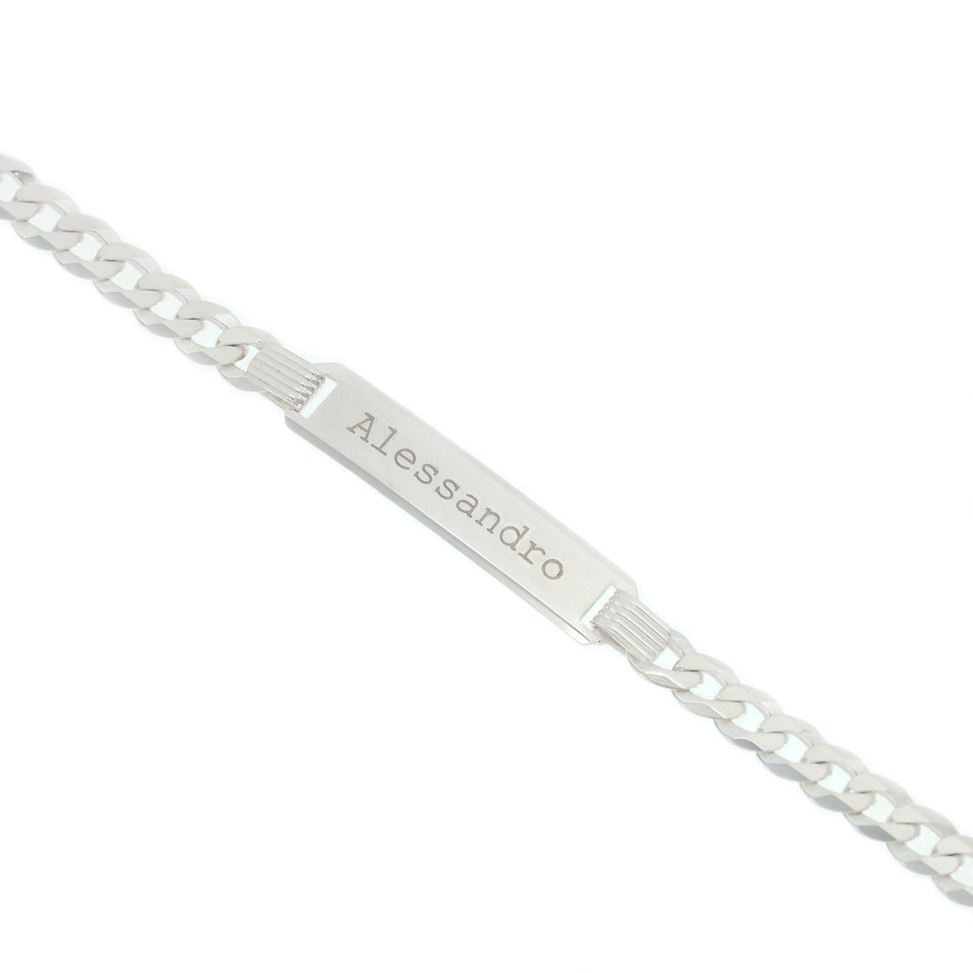 E' realizzato in argento 925 con catena grumetta piatta, ha una targa centrale su cui puoi scrivere ciò che vuoi: il nome di chi lo indossa, il nome dei figli, una parola o una data speciale.